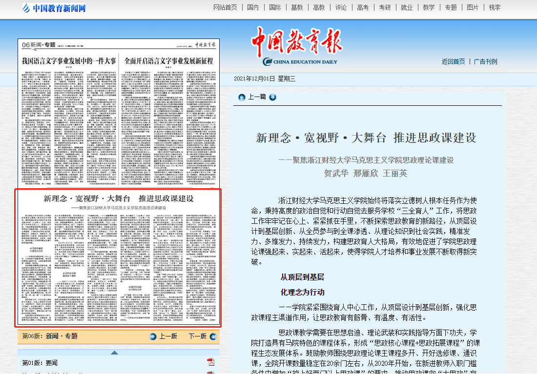 12月1日,《中国教育报》第六版以《新理念·宽视野·大舞台推进思政课建设为》为题,从理念引领、课程改革、教学育人、实践教学等四方面详细报道了我校思政课建设和教学改革的特色亮点。报道指出,伟德国际1946bv在习近平总书记3·18重要讲话精神和“三全育人”的理念指引之下,不断探索思政教育新路径,...
