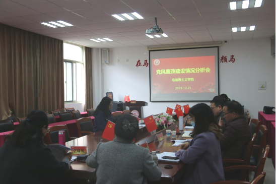 随后校纪委委员、法学院党委书记朱丹进行点评。她指出二级单位党风廉政建设分析会是全面从严治党的重要举措,马院2021年领导班子思想认识到位,会议准备充分,能围绕主题,落实责任意识强,会议质量高。同时就进一步深入贯彻落实党风廉政建设工作提出了三点要求。一是要进一步提高政治站位。不断增强“四个意识”,坚定“四个自信”,做到“两个维护”,深入领会“两个确立”,把准政治方向,深入组织开展党史学习教育,提高政治敏锐性和政治鉴别力。二是要切实做好本单位突出问题治理。结合党委巡视、校内巡查,做好“一清理两专项”工作,做好教育领域腐败整治,制定好行之有效的措施,规范工作程序,积极防范化解廉政风险,深入推进清廉学院建设。三是要进一步深入推进全面从严治党“四责协同”机制建设。做到与业务工作同研究、同部署、同检查、同考核,将全面从严治党落实到实处,为马院各项事业发展提供坚强有力的纪律保证。