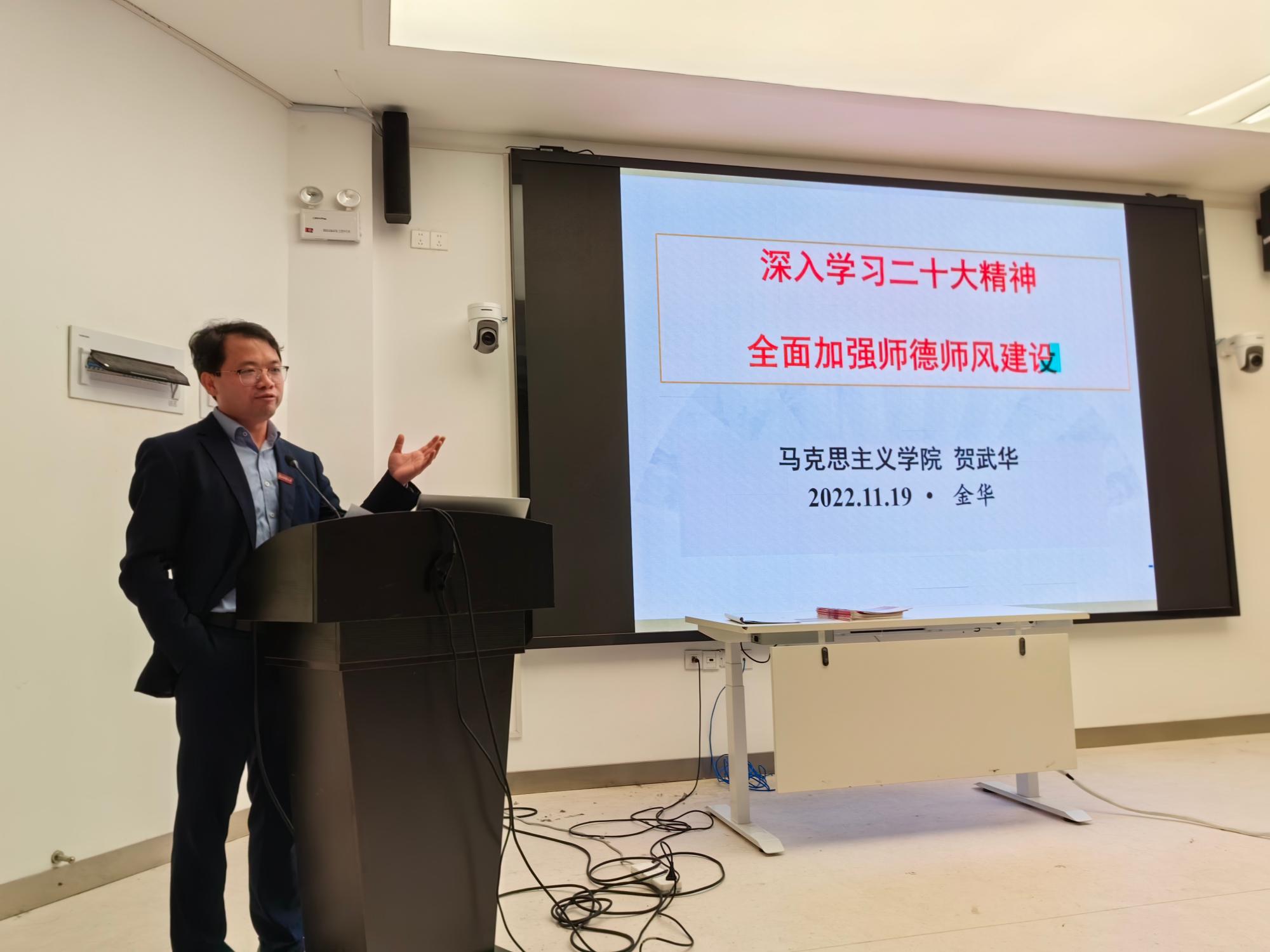 贺武华以《深入学习二十大精神,全面加强师德师风建设》为题,为全院教师作专题辅导报告。他强调,党的二十大报告中指出,要加强师德师风建设,培养高素质教师队伍,弘扬尊师重教社会风尚。全院教师要进一步学习《新时代高校教师职业行为十项准则》《全面深化新时代教师队伍建设改革的意见》等文件精神,明确新时代高校教师师德师风总要求。