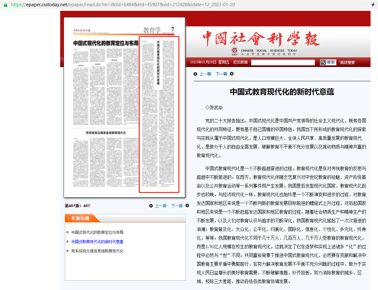 《中国社会科学报》2023年1月20日刊发了我院贺武华教授的文章:《中国式教育现代化的新时代意蕴》,全文如下: