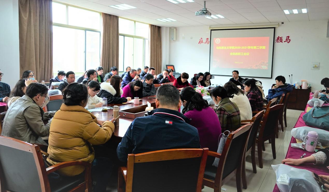 贺武华以理念、责任与使命为切入点,重点围绕“四史”教育、金课建设、提高思政理论课教学质量、学科科研工作、研究生培养、师资队伍建设、人才引进、岗位聘任与考核、学院文化建设等重要工作,向全院教师部署分析了学院本学期的工作重点,也对学院的工作提出了新的要求。贺武华院长强调,全体教师要明确马院定位,切实履行好立德树人、铸魂育人的使命,以开拓进取、奋勇争先、团结向上的精神在各条战线上努力添砖加瓦,为“十四五”开好局、起好步力尽所能,发挥伟德国际victor1946应有的作为。邢雁欣副院长解析了本学期主要教学工作安排,随后学院还召开了教研室主任会议和组织了工会活动。