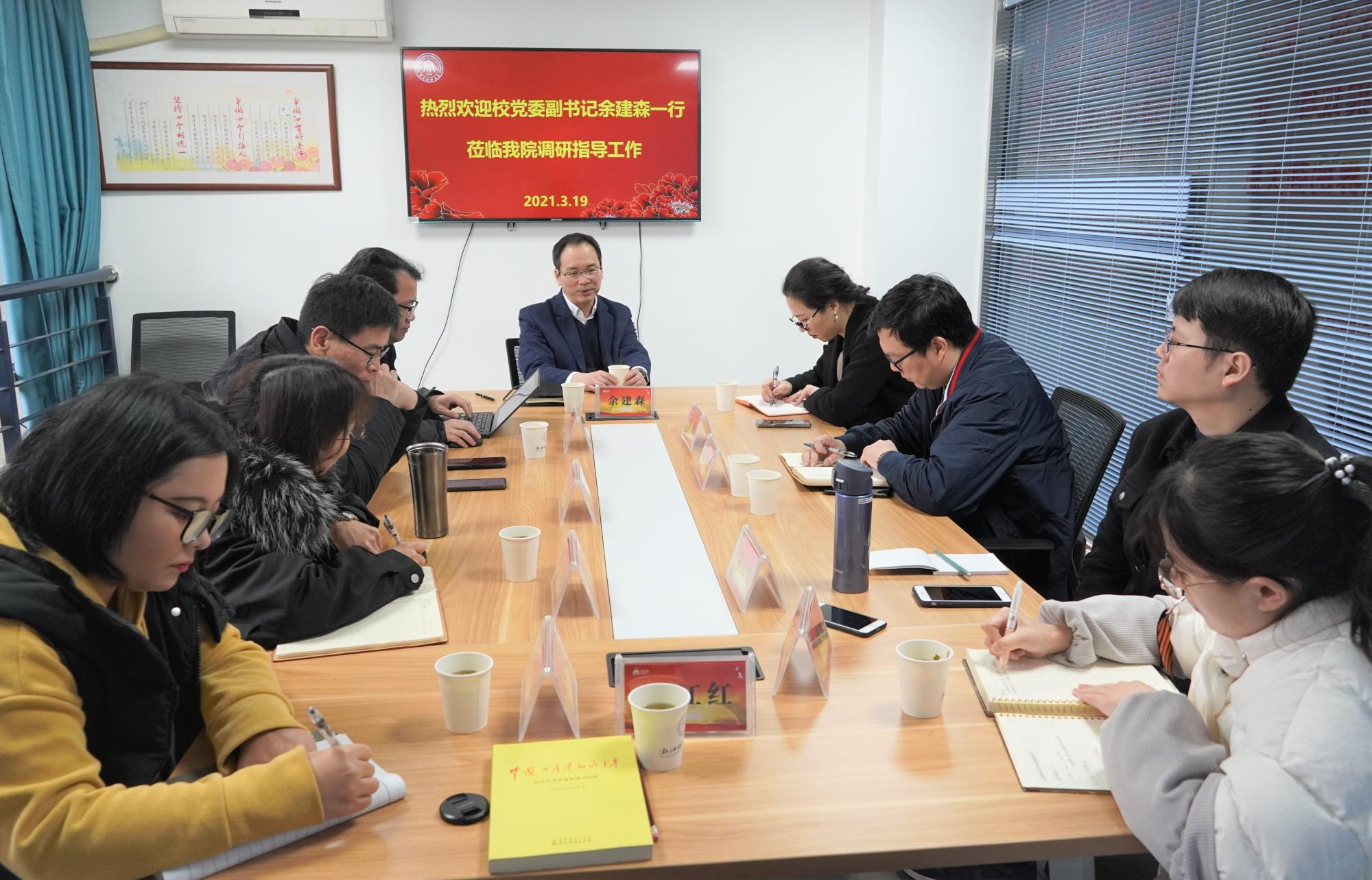 为进一步加强学院思想政治理论教育教学工作,推进学校“大思政”格局的建设,2021年3月19日上午,学校党委副书记余建森,学生处处长曹桢、校团委书记陆颋浩莅临我院指导工作。我院党委书记、院长贺武华,马克思主义基本原理教研室主任韩跃民、办公室主任祝丽萍、专职组织员宋维维,以及我院青年教师代表王江红、郑佳佳、杨晓帆出席此次会议。