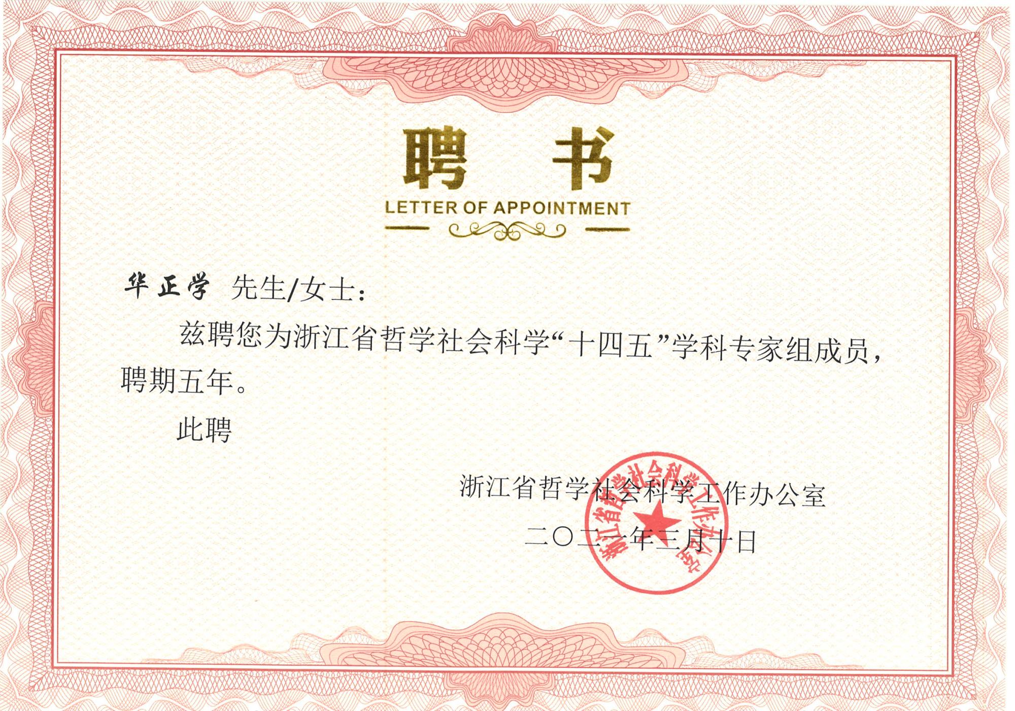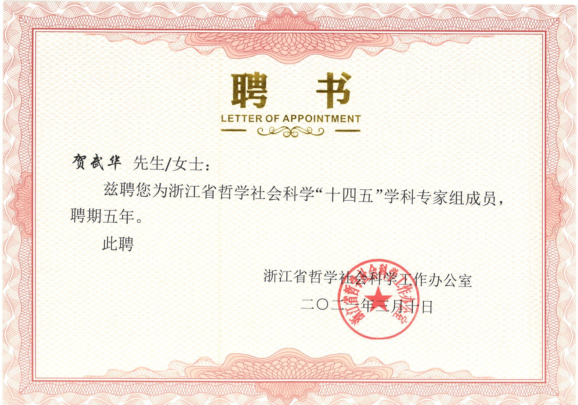 近日,浙江省社会科学发展规划领导小组公布了浙江省哲学社会科学“十四五”学科专家组成员名单。我院贺武华教授、华正学教授被聘为浙江哲学社会科学“十四五”学科专家组成员,聘期五年。