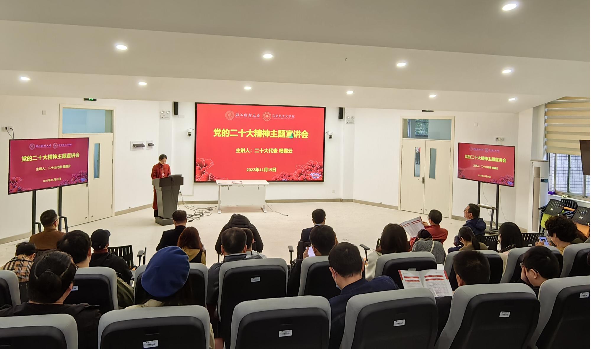 为深入学习宣传贯彻党的二十大精神,11月19日,党的二十大代表杨霞云应邀为我院教师作党的二十大精神宣讲报告,学院全体教师现场聆听了宣讲报告。报告会由学院院长贺武华主持。