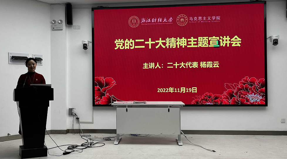 党的二十大代表、中宣部宣传思想文化青年英才、文化部青年拔尖人才、浙江婺剧艺术研究院国家一级演员杨霞云应学院邀请为我院教师作了党的二十大精神宣讲报告,以党的二十大亲历者的身份,以参会党代表的视角介绍了大会盛况和代表履职情况,分享了参会期间的所见、所闻、所学、所感,报告会主旨鲜明、内涵丰富、精彩生动。