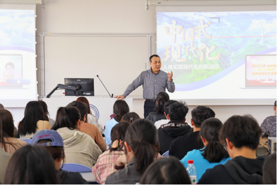 李金昌书记理论联系实际,将个人记忆和民族梦想交织在一起,回顾了中国过去几十年的经济发展历程,以自己作为六零后的亲身经历,讲述了“四个现代化”标语在当时社会的广泛影响,以及这一概念在他心中播下的现代化梦想。他图文并茂地讲解新中国在逆境中科技实力显著提升,当说到原子弹和氢弹的成功研制为中国式现代化的崛起奠定了坚实基础时,同学们不禁为之动容,感慨美好生活来之不易。