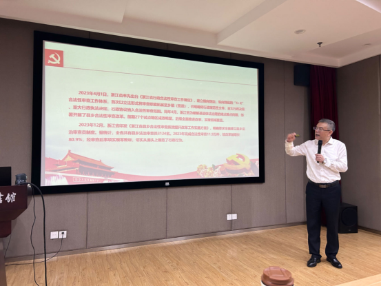 陈建华以“十一个坚持”为核心,阐释了习近平法治思想是内涵丰富、逻辑严密的科学理论体系,从历史与现实的贯通,国内与国外的贯通两个维度论证了习近平法治思想取得的重大突破和成就。陈建华结合在西湖区司法局的长期工作经验,从科学立法、严格执法、公正司法、全民守法四个方面鲜活讲授了浙江和杭州在司法实践中的现行探索和典型经验,例举了《浙江省优化营商环境条例》、《浙江省行政合法性审查工作规定》、“西湖码·我要帮”等浙江走在全国前列的特色做法。陈建华尤其结合“第二个结合”,强调了优秀传统法治文化在培养公民法律素养中的重要作用