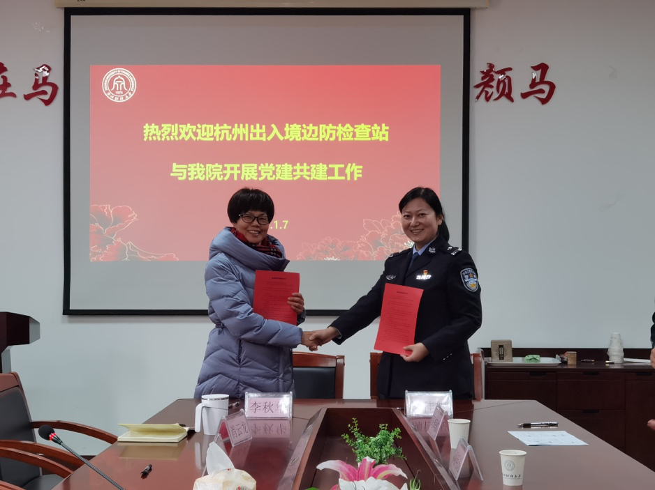 第三项,双方签署共建协议并集体合影留念。为进一步加强党支部建设,探索创新党建工作载体,提高党建工作水平,经双方协商,结为党建共建单位,开展党建共建活动。中共伟德国际victor1946委员会教工第一党支部和中共杭州出入境边防检查站执勤四队党支部共同签署了《党支部结对共建协议书》。双方本着“资源共享、优势互补、注重实效”的原则,通过共建活动平台、分享工作资源、交流工作经验、解决实际问题等途径,建立互帮、互学、互助的有效机制,实现党支部良性互动。共建时间为2021年1月7日至 2024年1月6日共3年时间。共建内容包括: