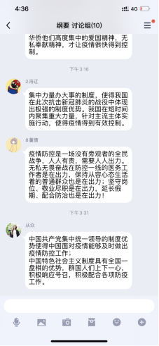 (冯庆旭老师班级讨论“青年责任与担当”截图) (高伟老师班级讨论制度优越性截图)
