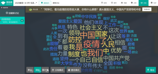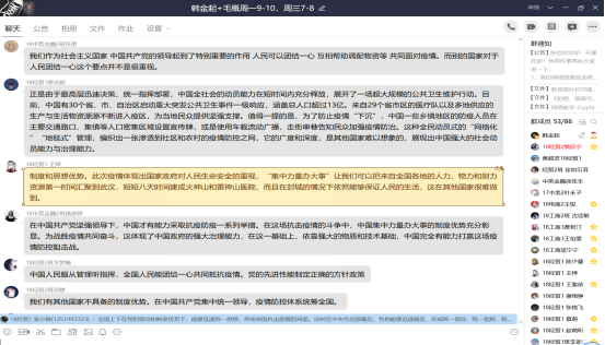“抗疫,我们有中国制度”、“战疫时期的青年责任与担当”、“自然、疫情与我”、“重大疫情与敬畏生命”、“致敬医护人员”等等,这些都是马院老师在直播结束后和学生讨论的主题,而每一个问题之下都有数百条甚至上千条学生的热烈回应。韩金起老师班上18经贸1班的王烨同学追问“此次疫情防控过程中,哪些做法在中国可以做到,其他国家不可以,我们的优势有哪些?”来自肖云龙老师班上的寇雅洁同学从爱国主义、中国共产党领导和中国特色社会主义制度的显著优势和“四个自信”的角度分别谈了自己的看法;冯庆旭老师班上的郑烨波同学认为:“在重大疫情面前,生命可以脆弱的只是一个个冰冷的数字,同时生命也是顽强的,顽强到可以奋不顾身的奔赴战场。此次疫情让我们看到了青年的力量,也让我感受到了自我担当意识,危险当前,总是有人要付出,别人可为,我为何不可为呢?”