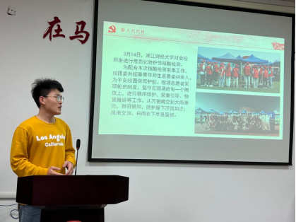 会议第二项议程,“薪火代代传”。会议中,通过图片展现了我校常态化防护性核酸检测志愿者坚守每一个岗位的坚韧风貌、彰显了我校同学于春运时期在杭州东站协助疫情服务的为人民服务的精神、表达了我校同学在家乡社区参与疫情物资援助的爱国爱家,与全国人民万众一心战胜疫情的信念。