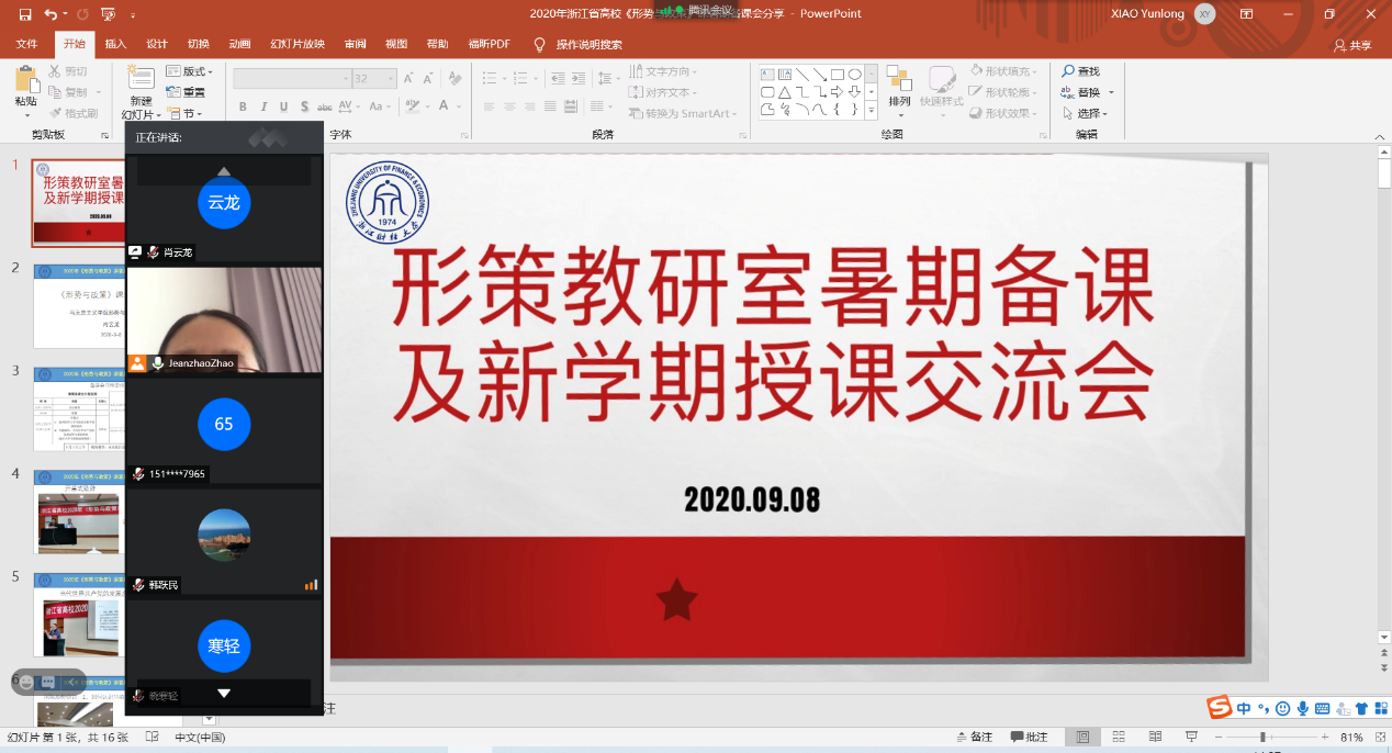 2020-09-28为进一步贯彻落实习近平总书记关于加强高校思想政治理论课建设的指示精神,践行高校思政课“立德树人”的理念,推进高校形势与政策教育,提高课程教学效果,我院形势与政策教研室于9月8日召开“暑期备课暨新学期授课交流会”,课程教学团队33名教师参加了线上会议。教研室主任赵春珍老师主持本次会...